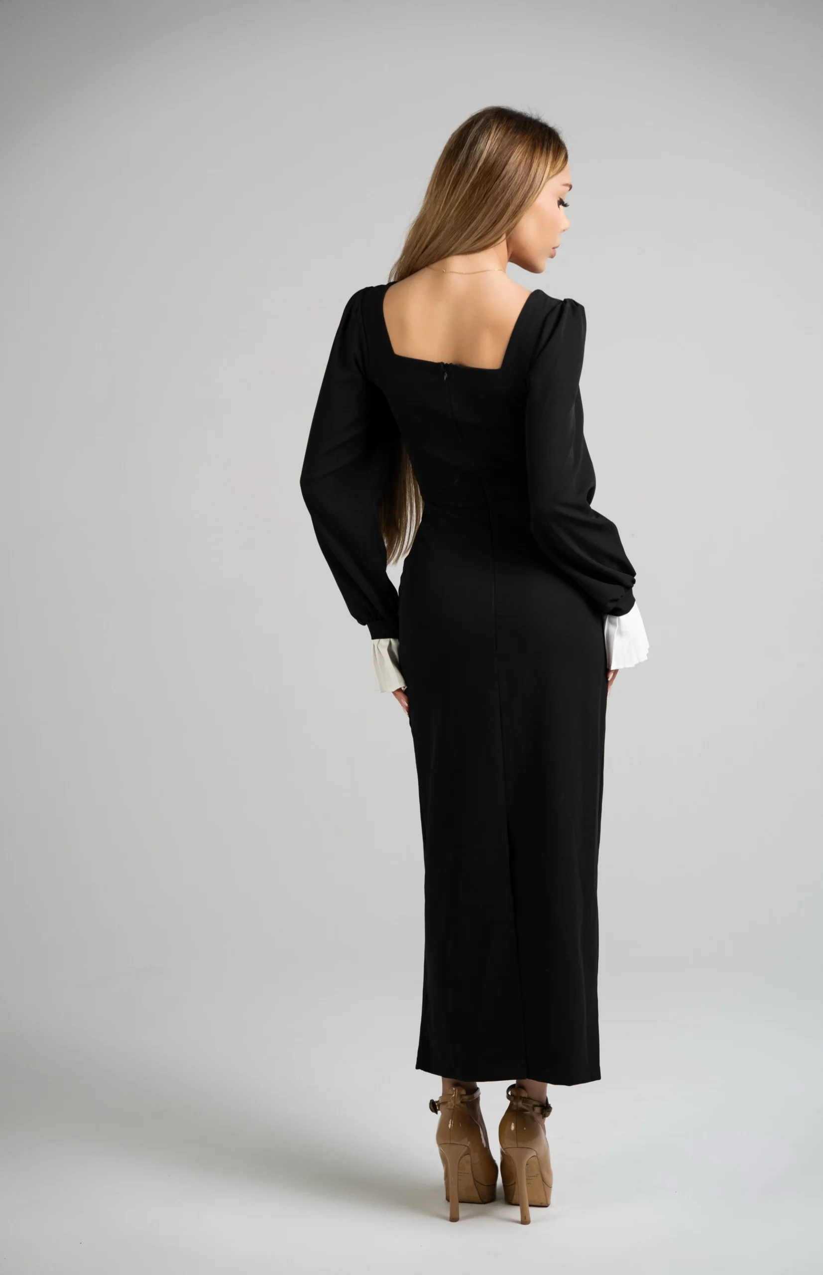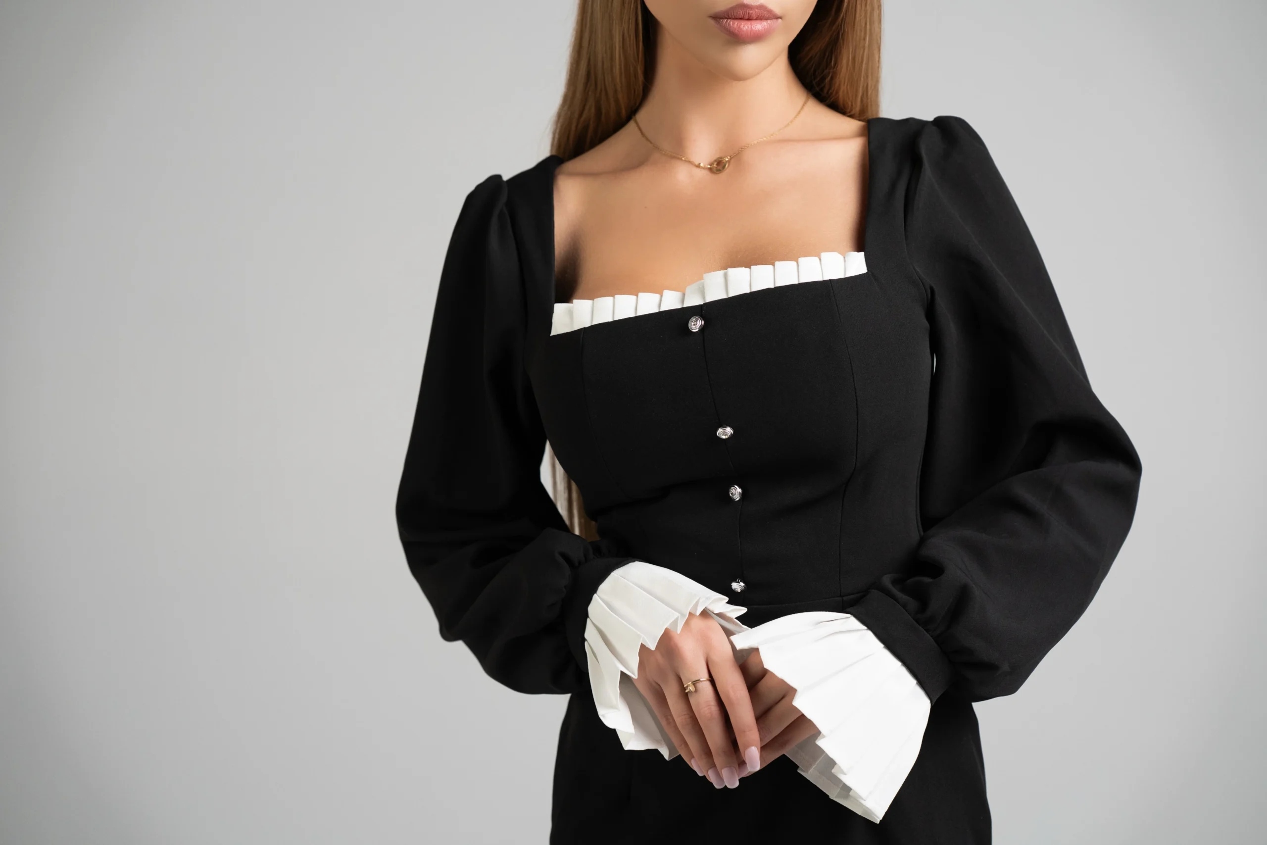 Дълга черна рокля с прав силует, който издължава фигурата и придава елегантност. Белите плисета по деколтето и маншетите създават красив контраст и придават характер, а кристалните копчета отпред добавят фин акцент. Пухкавите ръкави носят романтична нотка, която балансира изчистената линия.
